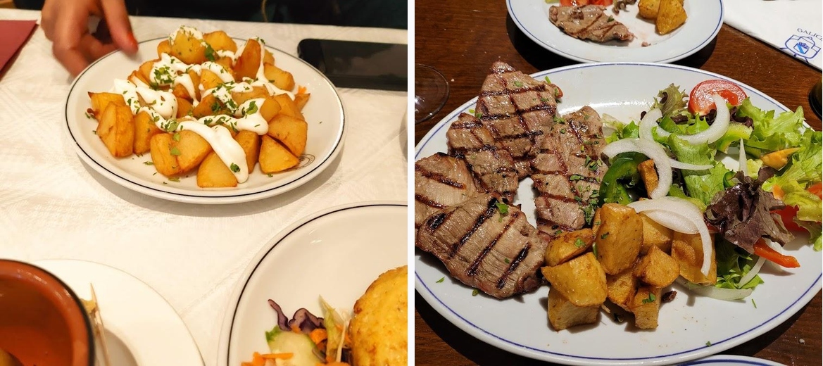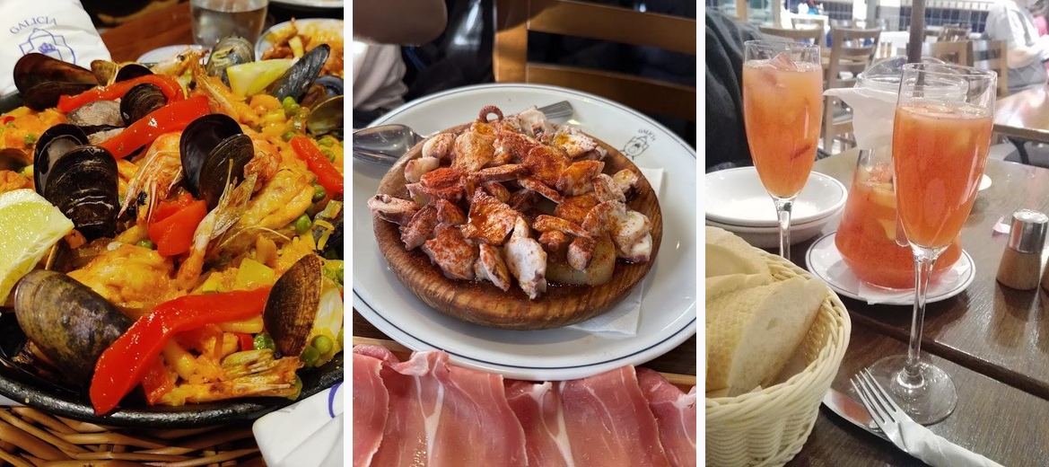 Galicia specializes in Galician and Spanish cuisine, offering dishes like paella, gambas al ajillo, and various tapas.